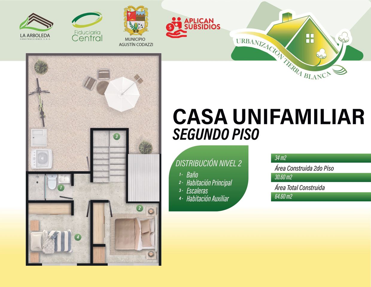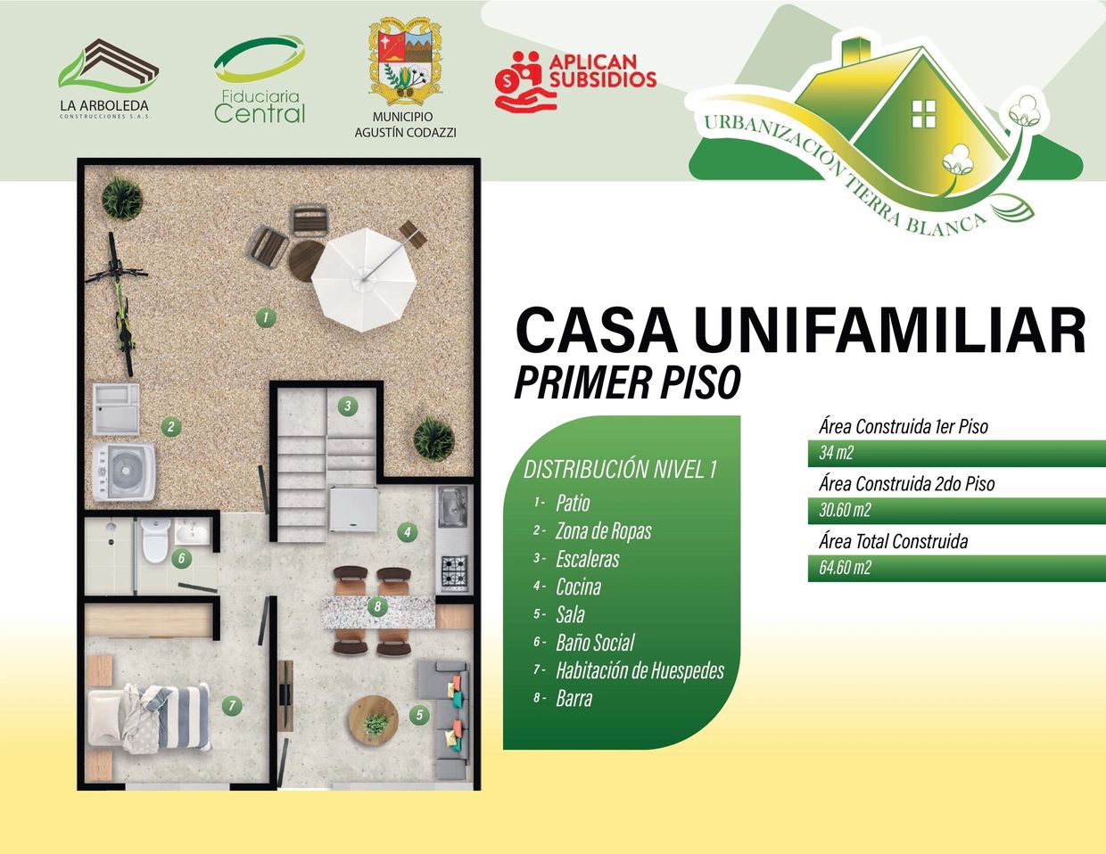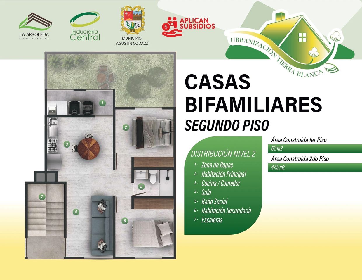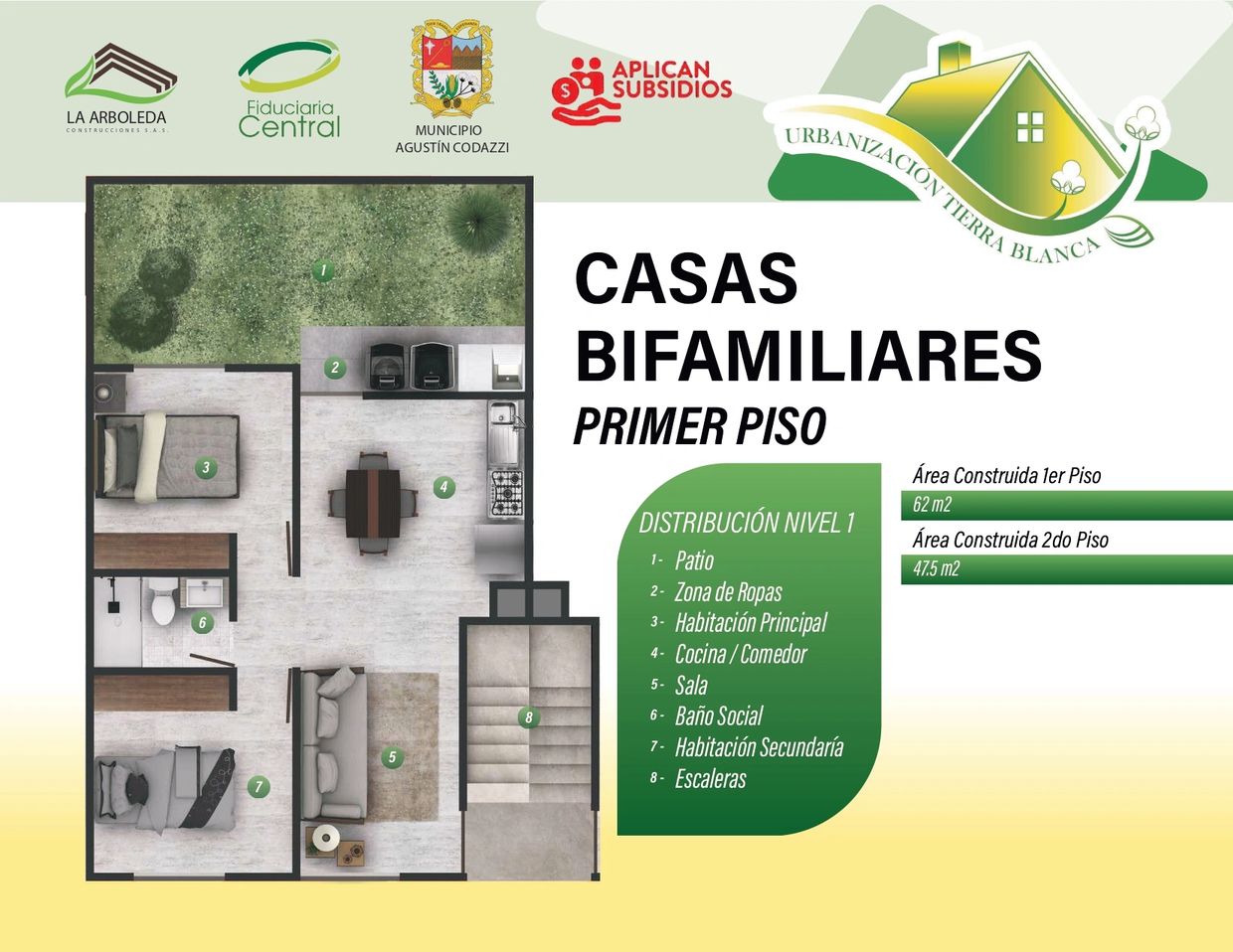 El proyecto Urbanización Tierra Blanca ubicado en el municipio de Agustín Codazzi, en el departamento del Cesar, es una iniciativa apoyada por la Alcaldía pensando en la población, en el desarrollo colectivo con la finalidad de que sus habitantes puedan cumplir su sueño de obtener una vivienda propia. Se desarrollará un conjunto cerrado de casas vis, distribuidos en 2 tipologías de vivienda, por un lado casas unifamiliares de 2 pisos con 64.60 m2 y casas bifamiliares de 2 niveles con 109.50 m2.